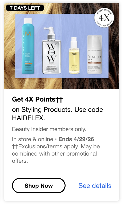 NEW Code HAIRFLEX – All Beauty Insider Members will receive 4X points on Hair Styling products.