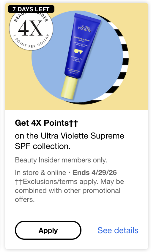 NEW Code UVSUPREME – All Beauty Insider Members will receive 4X points with the purchase of all Ultra Violette Supreme products.