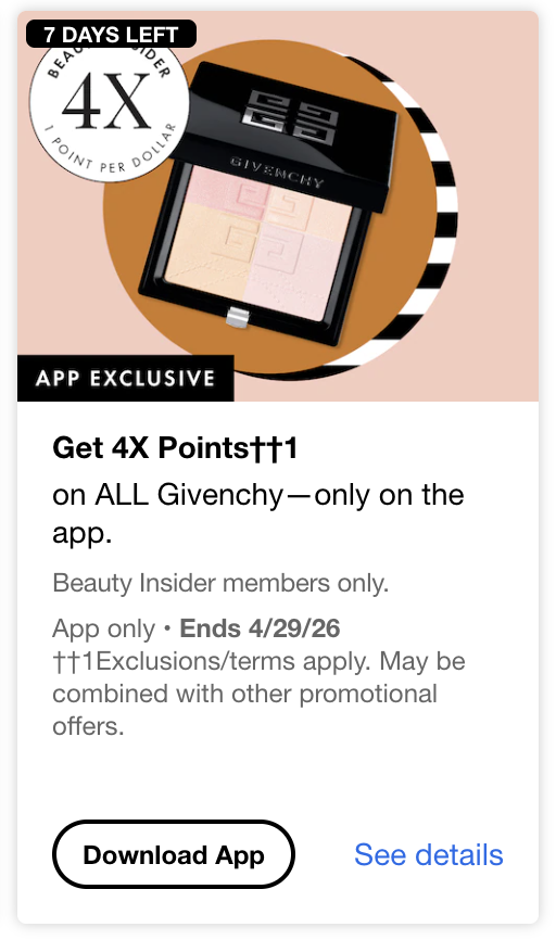 NEW Code 4XGIVENCHY – All Beauty Insider Members will receive 4X points with the purchase of all Givenchy products.