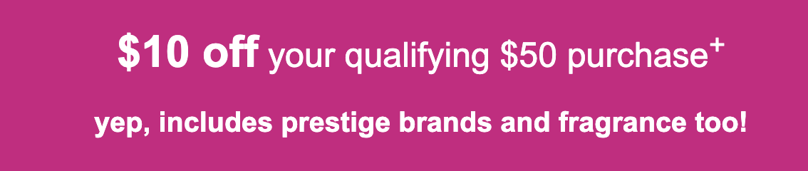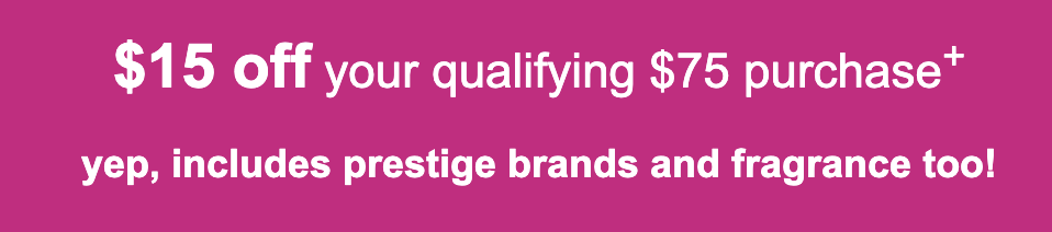Check your email to see if you get $10 off $50, $15 off $75 or $20 off $100 unique coupon code, including prestige brands and fragrances, ends 11/22