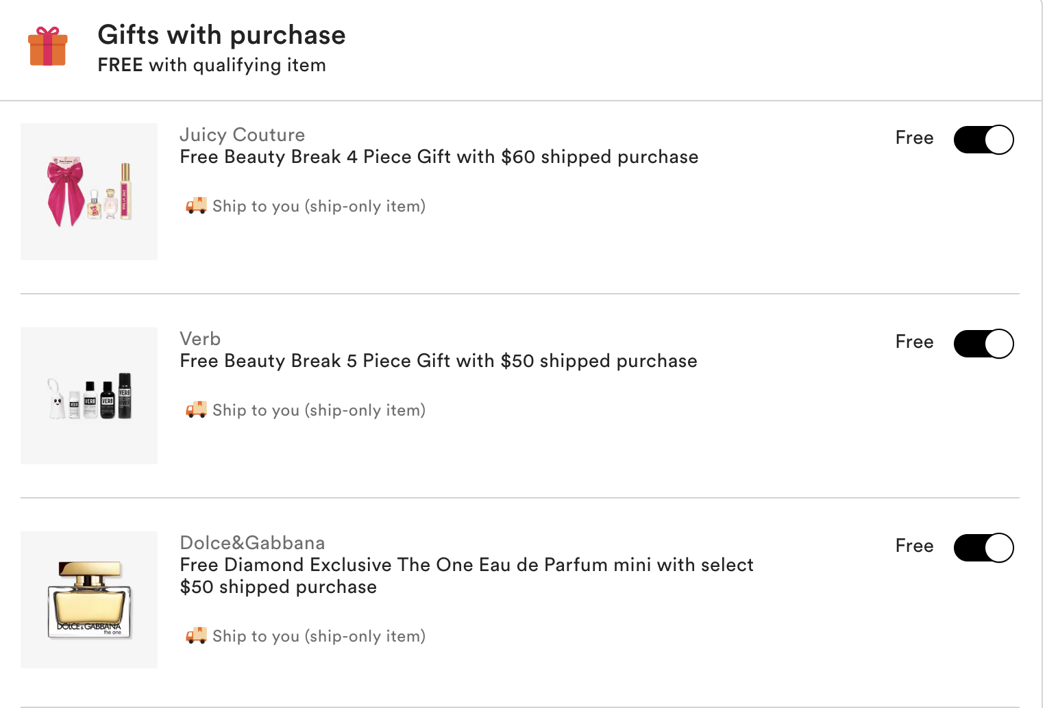 Free shipping all orders. Click here to the gift with purchase page.