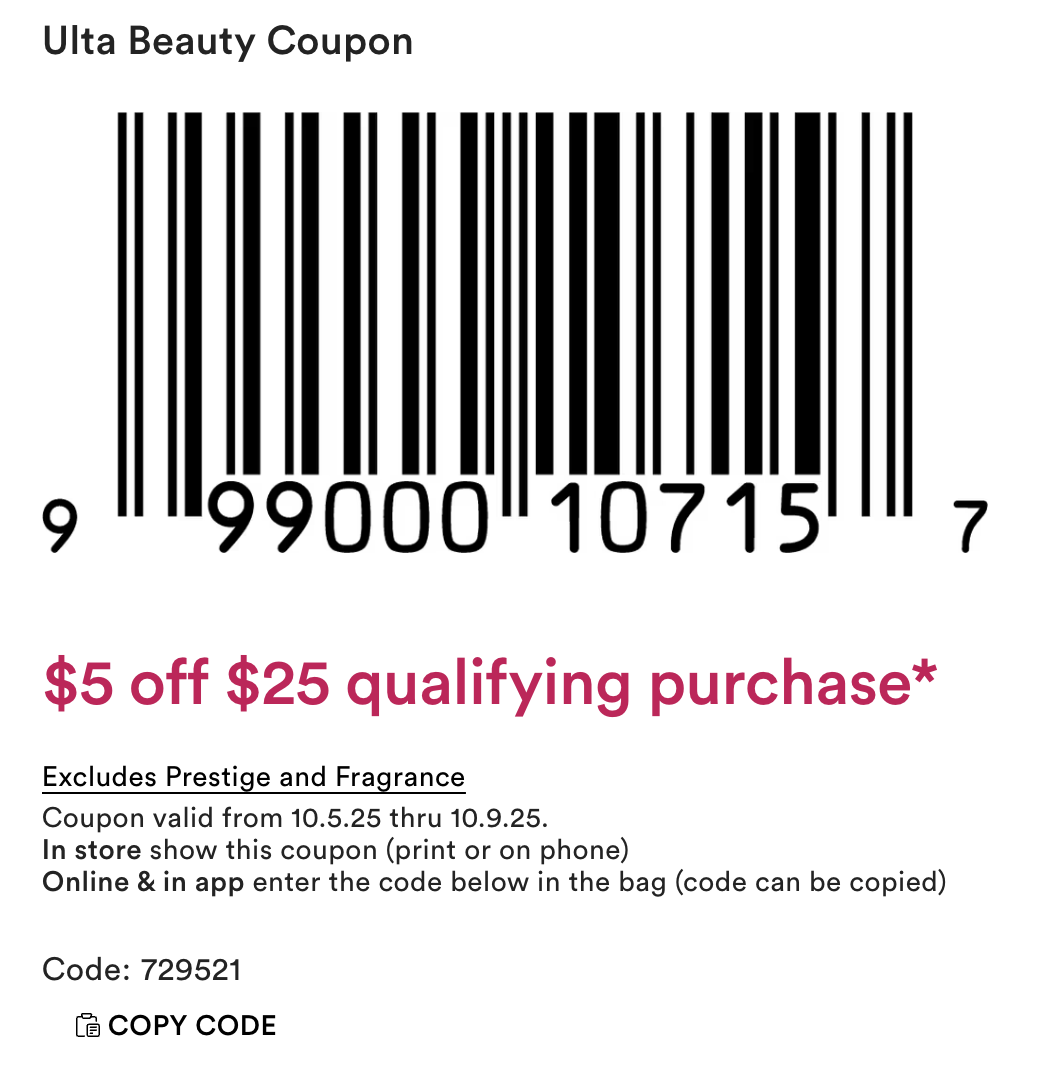 Coupon – Get $5 off $25 purchase with code 729521, excluding prestige brands and fragrances, ends 10/9. Click here for the in store coupon.