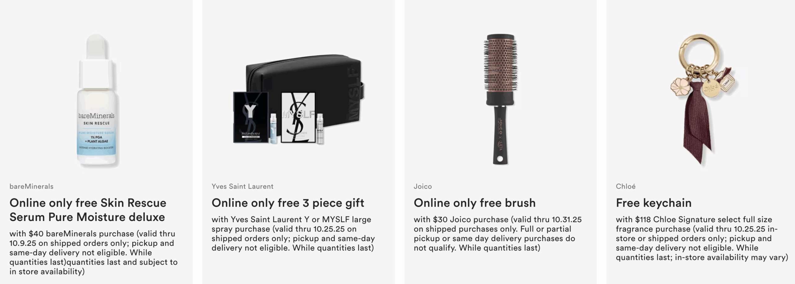 Free 4 piece Clinique gift with select $50 shipped purchase at Ulta.com. One per customer. MUST ADD TO BAG. While quantities last. Must have one non UB Marketplace™ Product in bag to qualify.