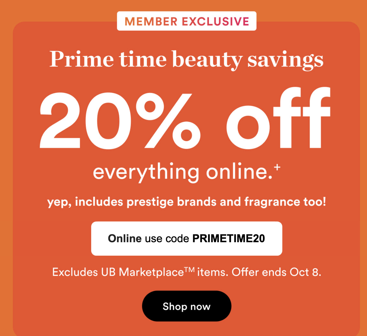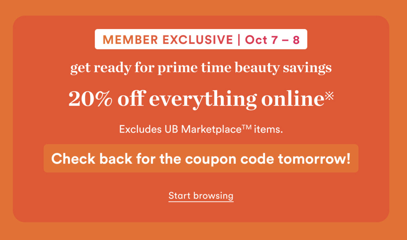 Get 20% off almost everything online with code PRIME20 at Ulta.com, including prestige brands and fragrances, 10/7 – 10/9.