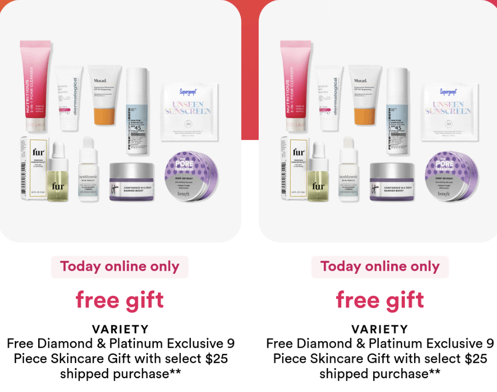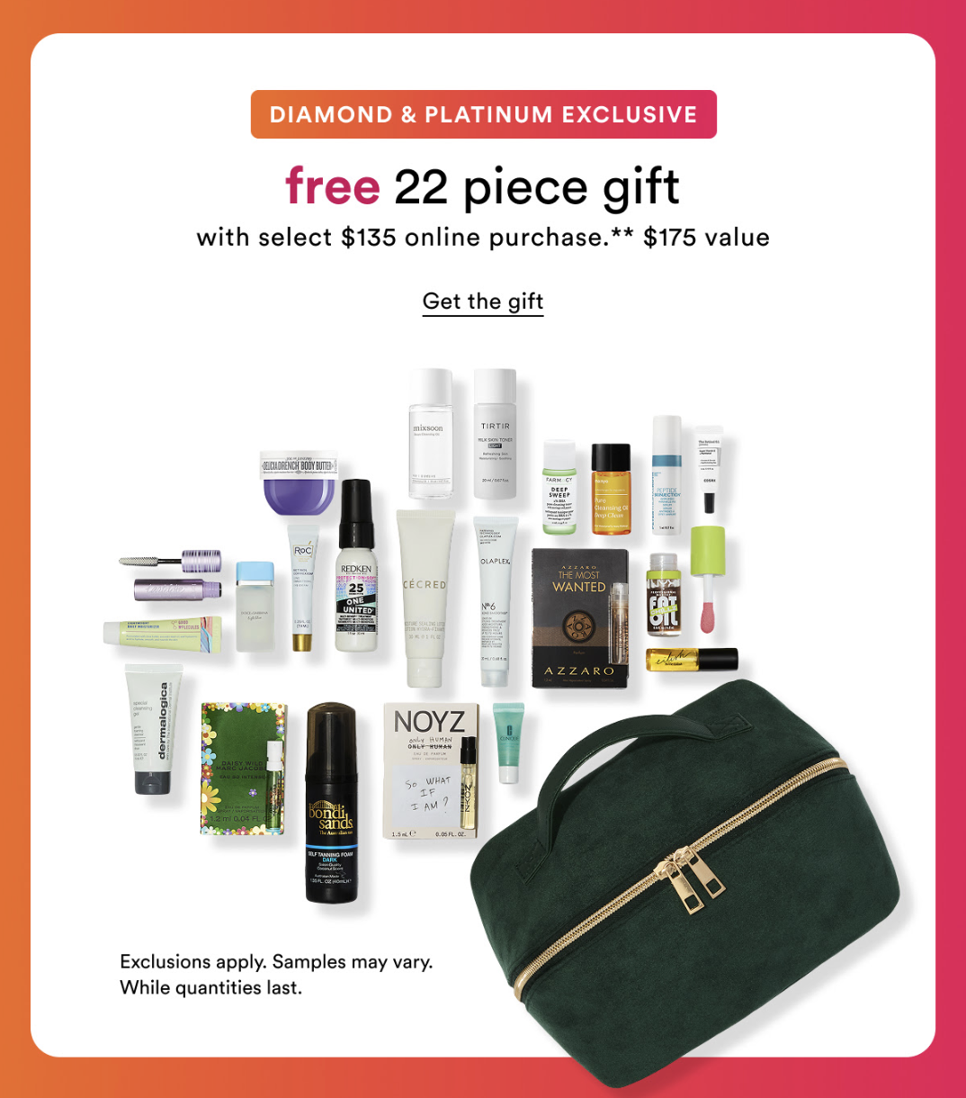 And, Free Diamond & Platinum Exclusive 22 Piece Beauty Bag with $135 shipped purchase