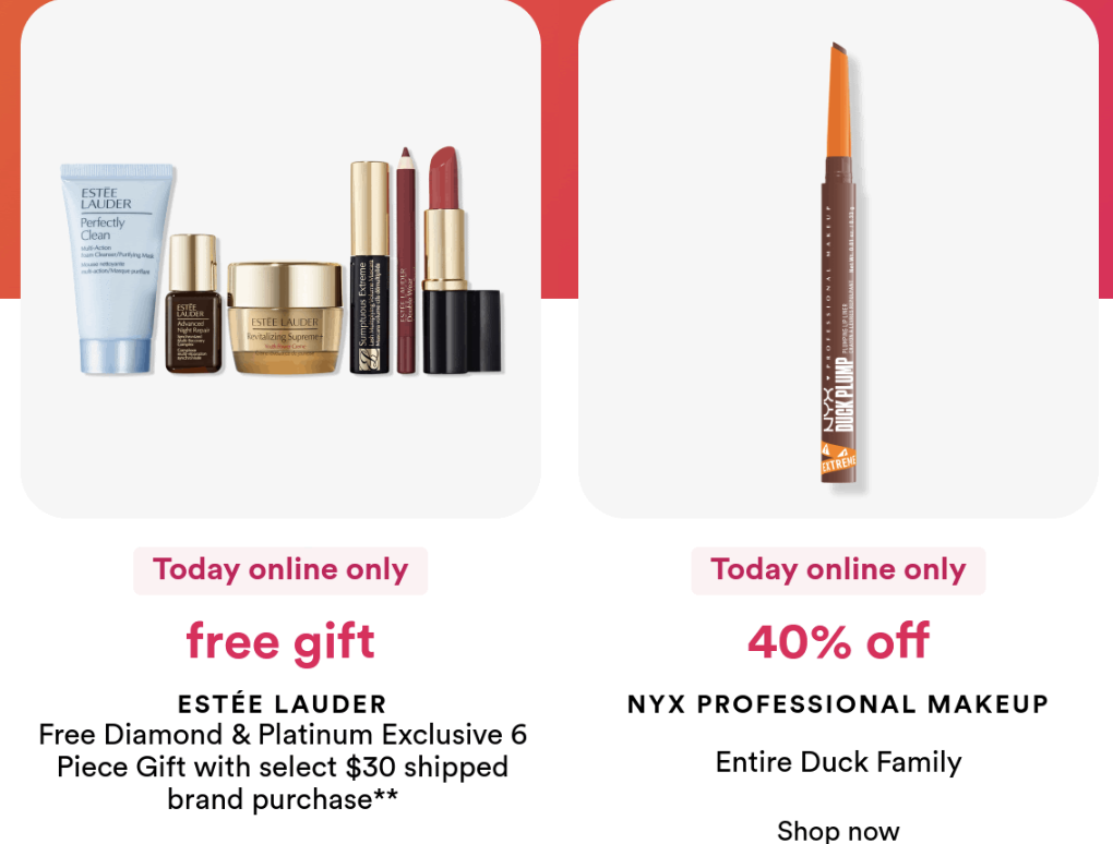 Free 5 Piece Estée Lauder Gift with select $50 shipped purchase only at Ulta.com. MUST ADD TO BAG. One per customer. While quantities last. Must have one non UB Marketplace™ Product in bag to qualify.