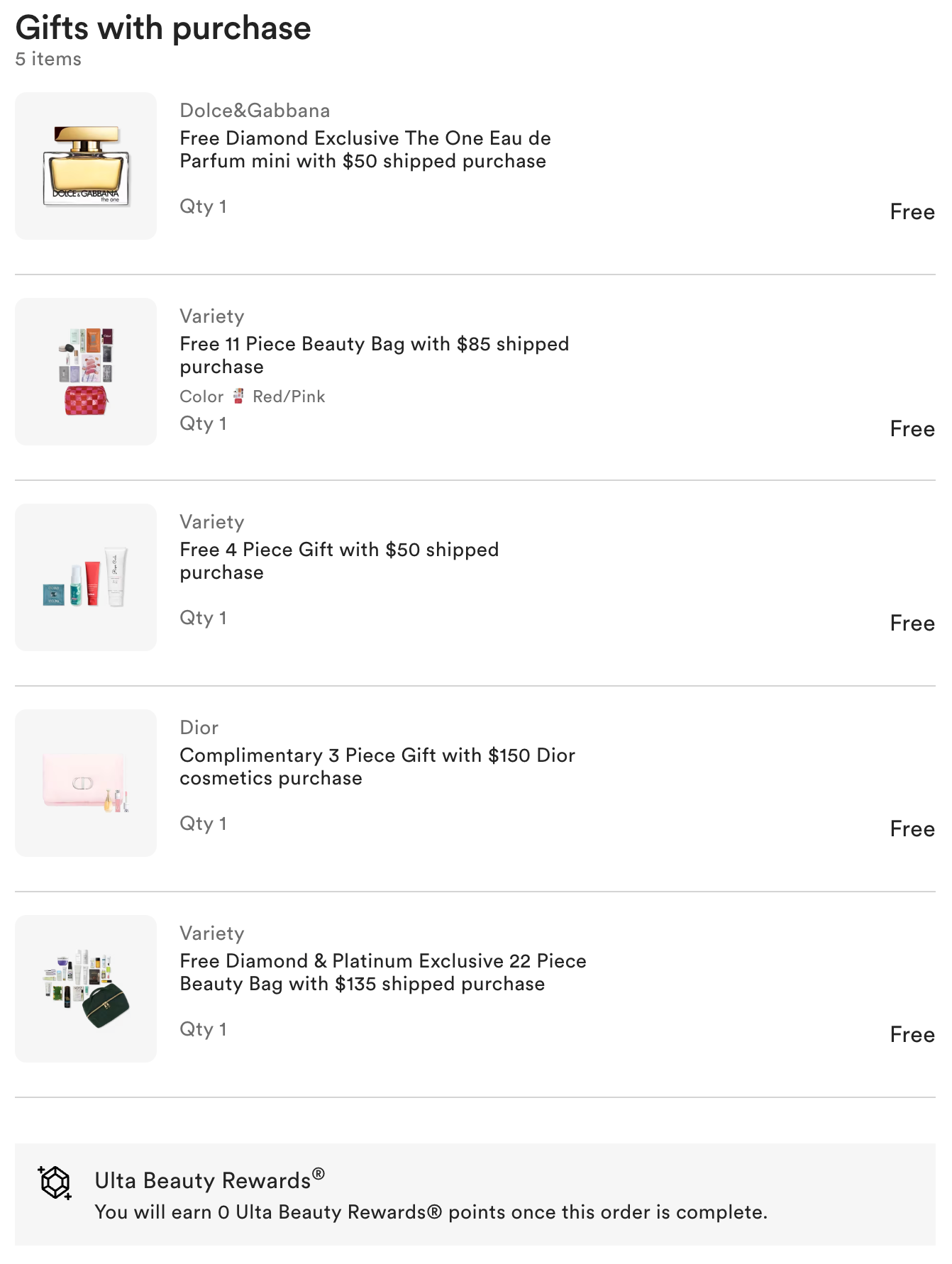 Here is my Today’s Ulta Order! I got some Dior + 5 GWPs + free shipping, paid 2000 points and $0.60! I am happy to place this order today!
