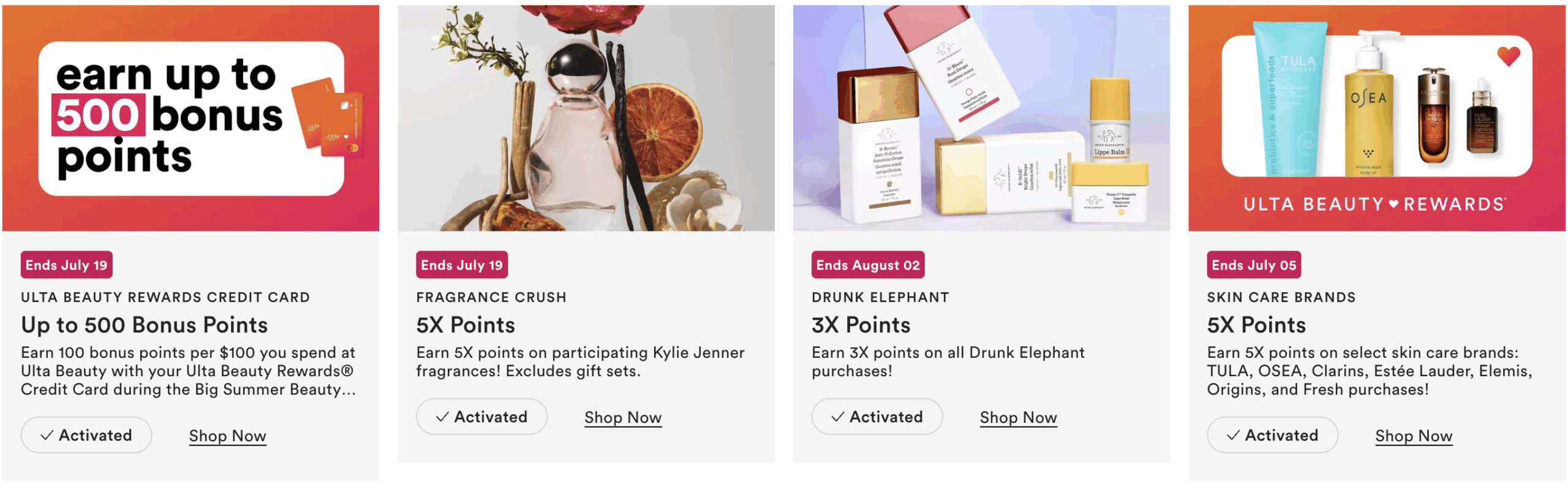 - Earn 100 bonus points per $100 you spend at Ulta Beauty with your Ulta Beauty Rewards® Credit Card during the Big Summer Beauty Sale. Earn up to 500 bonus points now thru 7.19.2025. Ends Sat, Jul 19 at 11:59 CDT