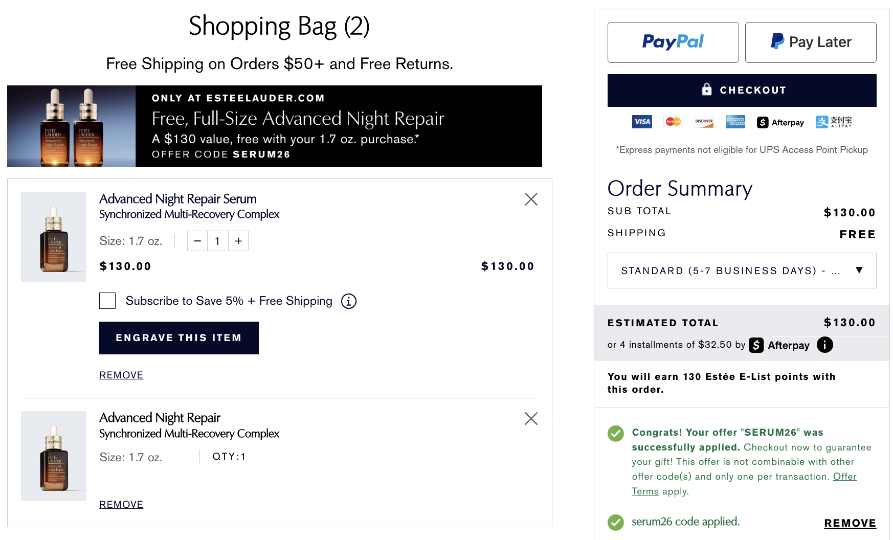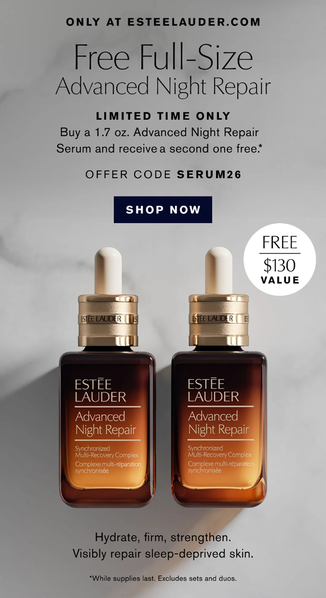 ANR Serum 1.7 oz Buy 1 Get 1 FREE at Estee Lauder, a $130 value, ends 4/26. Use code SERUM26.