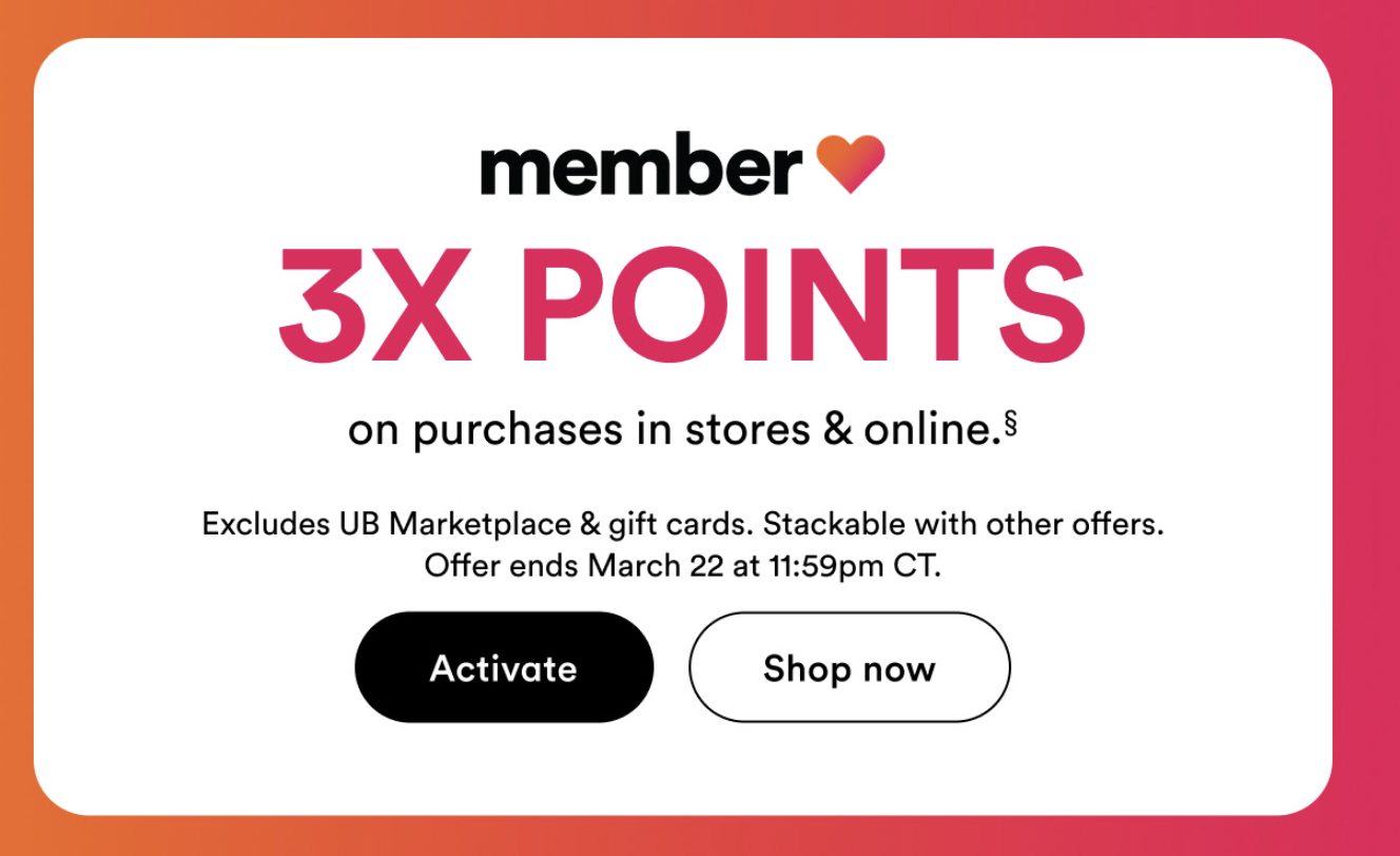 - Members earn 3X points on qualifying purchases! Excludes UB Marketplace and gift cards. Ends Sun, Mar 22 at 11:59 CDT