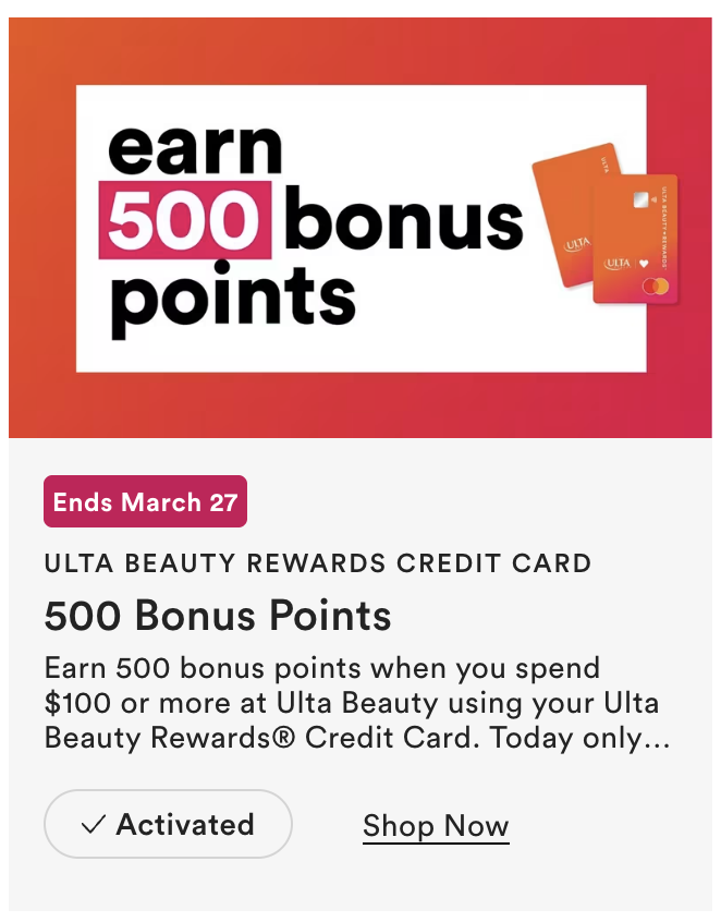 NEW Earn 500 bonus points when you spend $100 or more at Ulta Beauty using your Ulta Beauty Rewards® Credit Card. Today only! Excludes UB Marketplace, third-party marketplaces, gift cards, and auto-replenish orders. Ends Fri, Mar 27 at 11:59 CDT