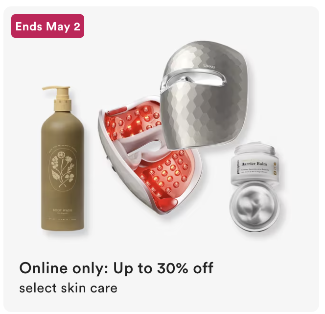 Online only, up to 30% off select skincare, ends 5/2