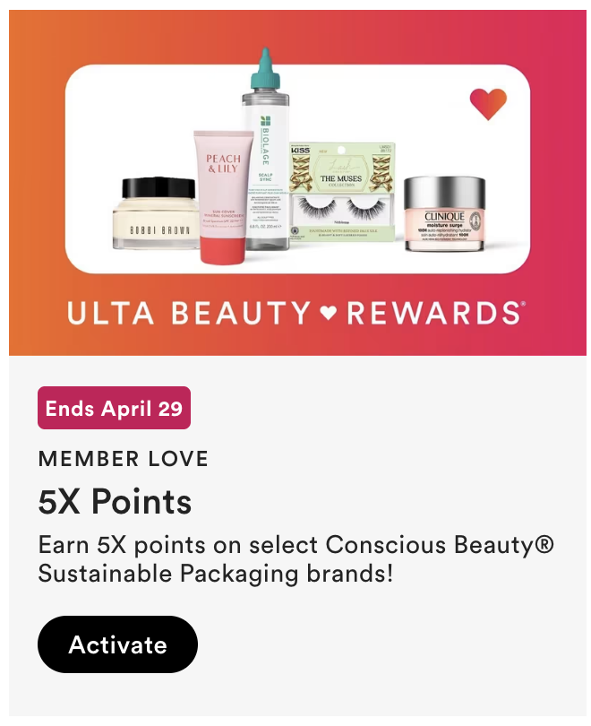 - Earn 5X points on select Conscious Beauty® Sustainable Packaging brands! Ends Wed, Apr 29 at 11:59 CDT